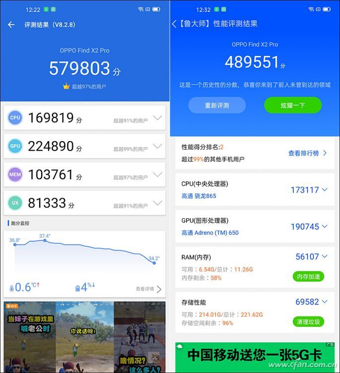 作为旗舰,OPPO Find X2 Pro自然也要用上时下最好的硬件。除了前面提到的屏幕以外,这款产品还搭载了高通骁龙865移动平台,内置12GB LPDDR5内存和256GB UFS3.0闪存,后者还支持TW+HPB技术,读写性能几乎和UFS3.1差不多。