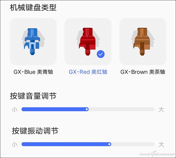 除此之外,iQOO 3还在输入法中引入了机械键盘模式,可以提供类茶轴、类青轴、类红轴的输入感受,不仅虚拟键盘皮肤更酷,在不同轴的设置下,点击虚拟按键时的触感和音效也有着明显的区别,比如小编就喜欢类青轴的段落感,噼里啪啦的打字非常爽。
