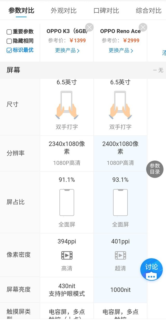 为了让大家有更直观的感受,我们那和两款手机作对比,两款手机同为AMOLED屏幕,前者最高亮度为430nit,后者亮度可达1000nit;前者的面板供货商没有说明,后者的供货厂商为三星。此外, Ace的屏幕优势还体现在采用E3显示材质、90Hz刷新率、支持DC调光等硬件优势上。