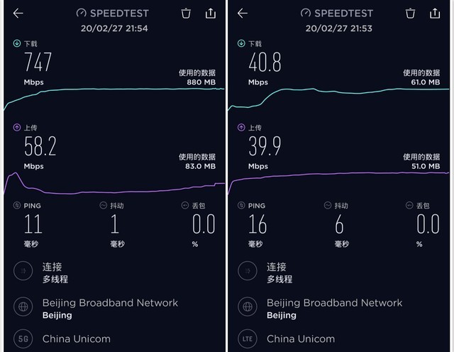 Speedtest实测,vivo Z6的5G的下载速率为747Mbps,上传速率达到了58.2Mbps,这个成绩符合联通5G套餐的网速。同一位置下切换回4G网络,下载速率为40.8Mbps,上传速率达到了39.9Mbps。目前5G网络大幅度优于4G网络。