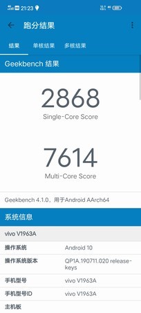 vivo Z6的跑分较为不错,总分为319133分;Geekbench 4单核2868分,多核7614分;分数也很均衡,可以说骁龙765G在应对游戏荷载也是没有太大压力的。