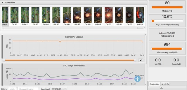 通过Gamebench的帧率记录,vivo Z6运行王者荣耀时达到60帧满帧是毫无压力的,而且帧率曲线非常平稳,全程几乎没有波动,可见vivo Z6运行目前主流的大型游戏是毫无压力的。