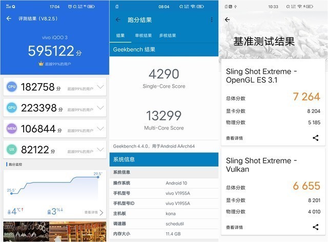 同时iQOO 3配备LPDDR5运存,首发的UFS 3.1闪存,上述都是顶级旗舰的配置,发布会上官方也宣布安兔兔跑分突破61万。针对iQOO 3的性能表现,我们也做了一些跑分实测,以供参考。