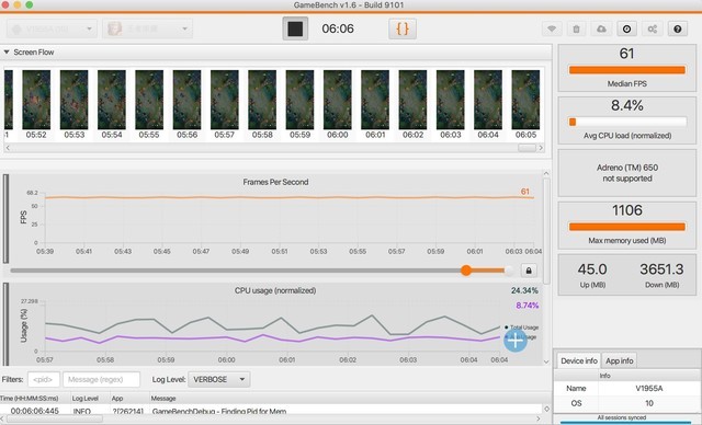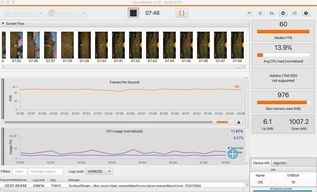 用Gamebench记录iQOO 3在《王者荣耀》游戏过程中的具体表现,5v5团战竞技,全程保持在60帧满帧状态,而且没有出现明显的帧率波动现象,性能调度积极的同时CPU占用率才8.4%,优化控制的很好。