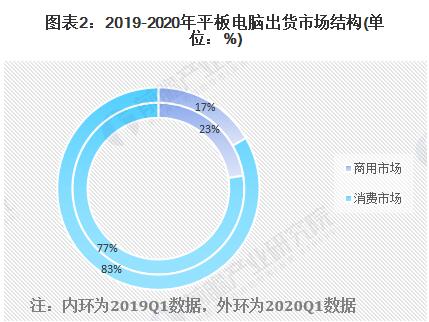 从平板电脑的出货市场结构来看,平板电脑近年来多用于消费市场。2020年第一季度,平板电脑商用市场出货量为62万台,仅占平板电脑总出货量的17%。其出货量占比下降的一大原因是疫情的发生导致大量企业与学校停工停产,使得部分平板采购项目延迟或取消。