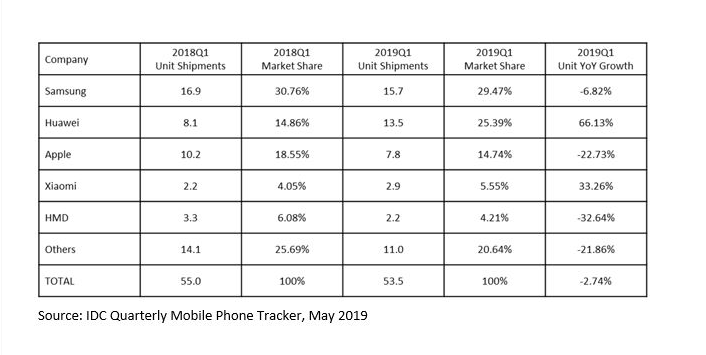 从出货量排名来看,三星依然位列第一,Q1出货量达1570万台,市场份额29.47%,同比下滑6.82%;华为紧随其后,出货量达1350万台,市场份额飙升至25.39%,同比大增66.13%。