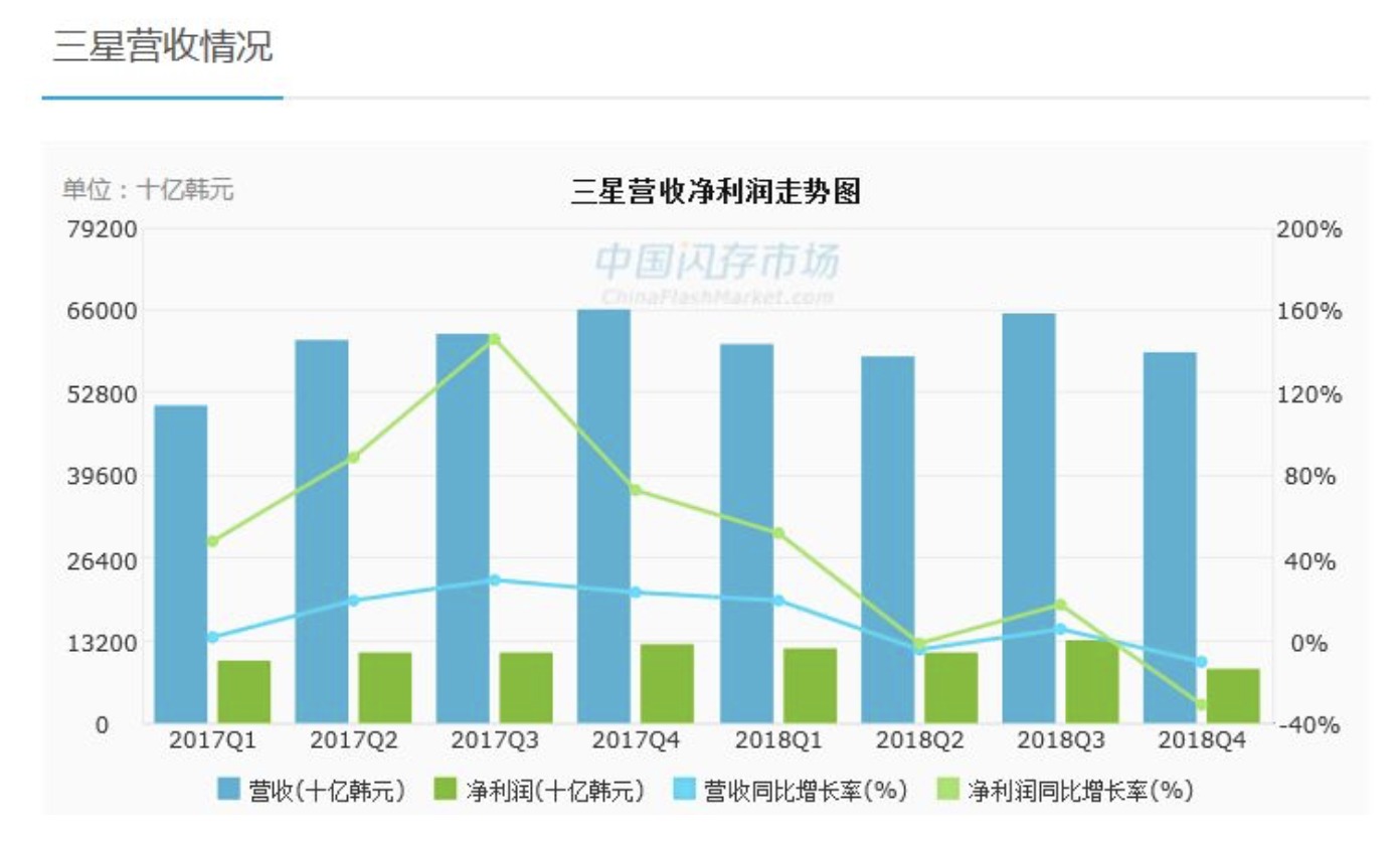 DRAM价格下滑的影响,三星预估2019年首季营收52兆韩元(约458亿美元),同比下滑14%;营业利润6.2兆韩元(约55亿美元),同比下滑60.4%。