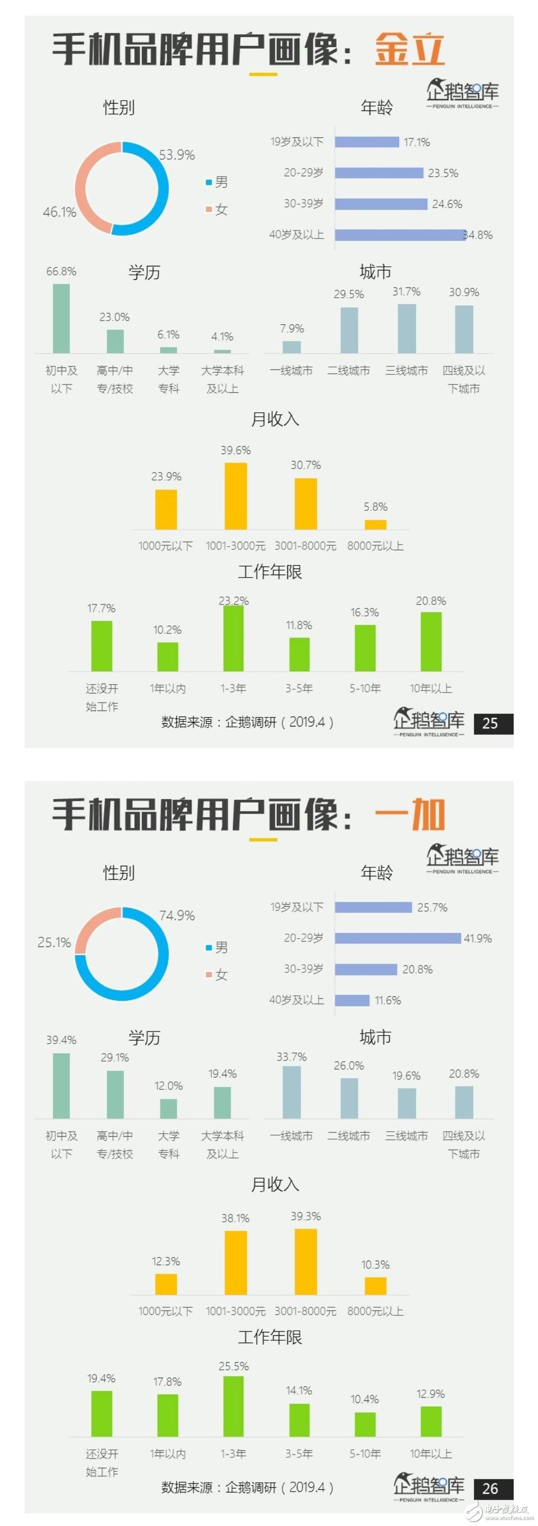 最后看看已经凉了的金立,53.9% 为男性,46.1% 为女性;66.8% 的用户为初中及以下学历,一线城市用户最少,仅有 7.9%。