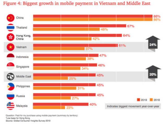 据国外媒体报道,根据普华永道会计事务所2019年全球消费者洞察力调查(GlobalConsumerInsight Survey 2019年)显示,越南是全世界移动支付增长最快的国家,与去年相比增长了24%,61%的消费者使用这类服务。