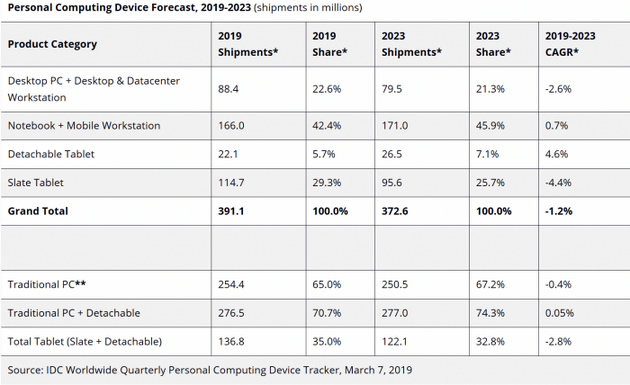 去年,研究公司IDC报告称,2018年第二季度PC出货量经历了六年来的首次同比增长。然而,最终,整个一年的市场都在下滑,部分原因是英特尔CPU短缺。尽管有所改善,但预计这些问题将继续阻碍该行业的增长,尤其是在入门级设备数量方面。