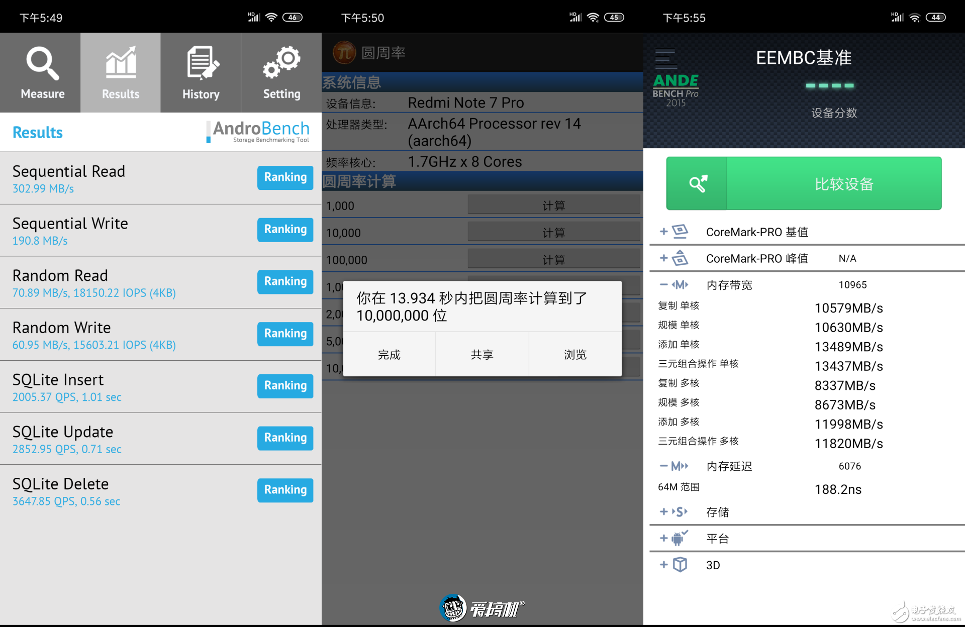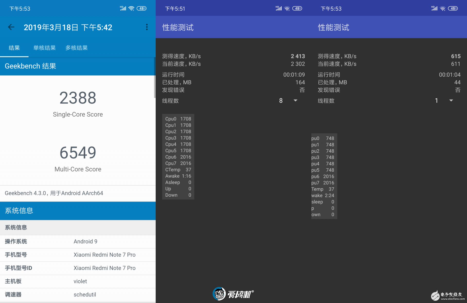 Redmi Note 7 Pro 搭载了高通骁龙 675 SoC,这是第二款开卖的骁龙 675 手机,骁龙 675 采用 2 大核 + 6 小核设计,大核基于 A76 架构,最高频率 2.0GHz;GPU 为 Adreno 612,最高频率 845MHz;eMMC5.1 闪存。下面通过简单跑分粗略看一下 Redmi Note 7 Pro 的性能表现。
