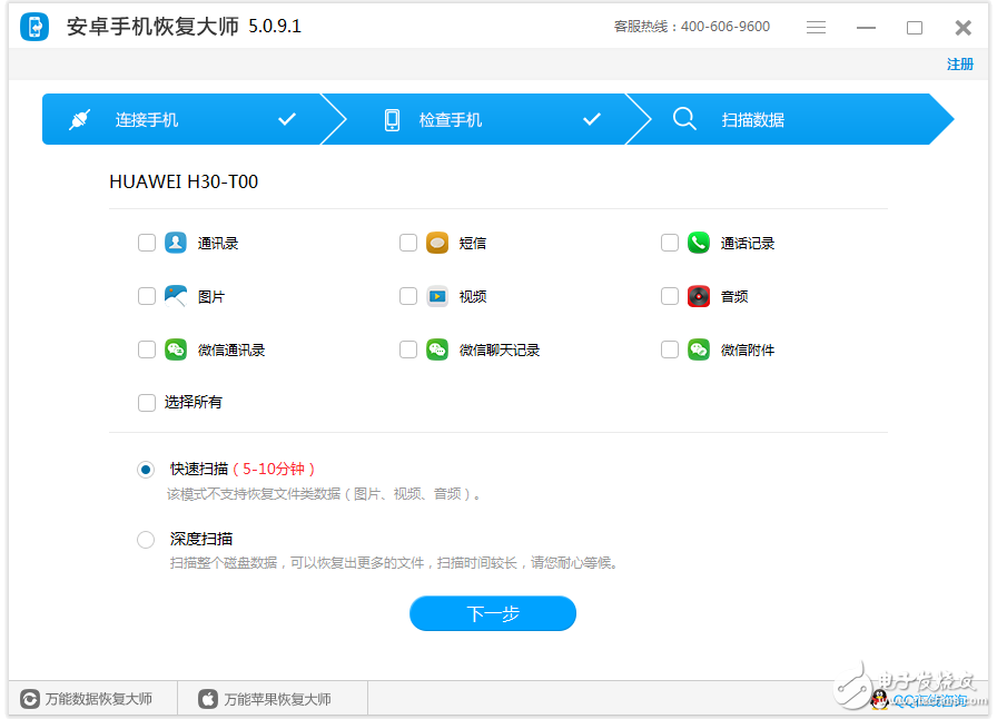 第三,运行安卓手机恢复大师软件,在软件界面上选择需要恢复的数据类型,只要在图片下面一栏打钩即可。