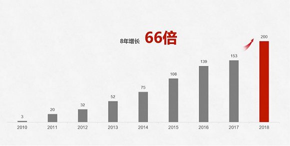 2010年至2018年华为智能手机发货量(单位:百万台)