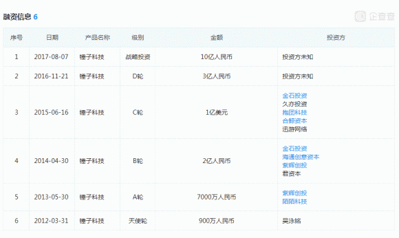 锤子科技融资情况(来源:企查查)