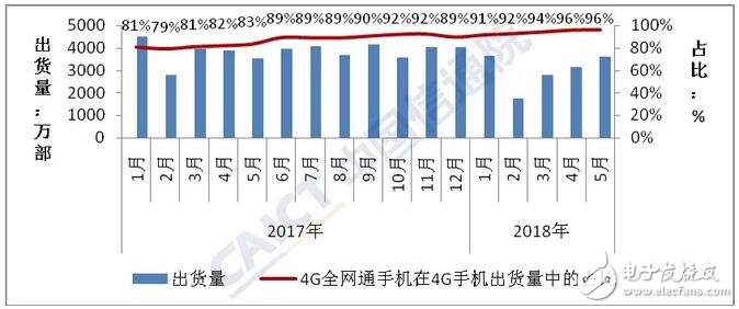 图2 2017年至2018年5月4G手机出货量及4G全网通手机占比