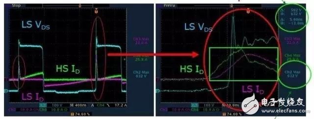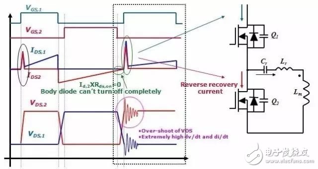 时序3, Q1此时开始导通,由于负载的变化, 此时MOSFET Q2的体二极管需要很长的时间来反向恢复。当二极管反向恢复没有完成时MOSFET Q2出现硬关断, 此时Q1开通,加在Q2体二极管上的电压会在二极管形成一个大电流从而触发MOSFET内部的BJT造成雪崩。