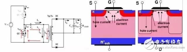 Q1和Q2关断时对于传统MOSFET和CoolMOS来说内部电子和空穴路径和流向并没有太大的区别。