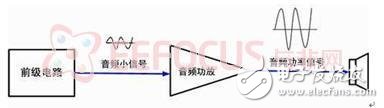 先把数字信号进行转换为模拟信号,通过音频功率放大器对比较小的音频信号进行放大,使其功率增加,然后输出。其原理如图所示,前置放大主要完成对小信号的放大,使用一个同向放大电路对输入的音频小信号的电压进行放大,得到后一级所需要的输入。后一级的主要对音频进行功率放大,使其能够驱动电阻而得到需要的音频。