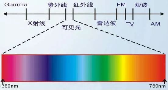 蓝光损伤是指光源中的高能短波蓝光。自然界中还有很多不同的波长,人眼会识别成不同的颜色。有的还看不出颜色,比如 X 光和一些射线,还有颜色不恒定的波长。我们先看看正常可见光光谱