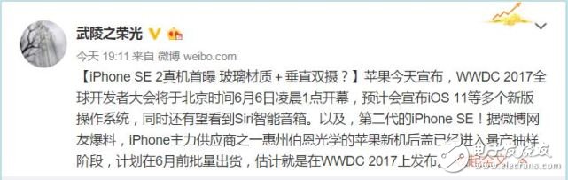 电子发烧友早八点讯:苹果已经公布了WWDC 2017全球开发者大会的时间为6月6日,同时坊间普遍预计包括iOS 11系统和Siri智能音箱等新品将会正式登场。而现在,有网友在微博上曝光了疑似iPhone SE二代的后盖的谍照,看上去似乎改用了玻璃材质,据称已经进入量产抽样阶段,计划在6月前批量出货,所以推测很有可能在WWDC上与我们正式见面。