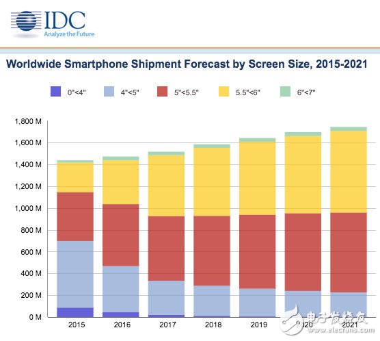 IDC预计,绝大多数智能手机市场,将由5-5.5英寸(不含)和5.5-6英寸(不含)机型“平分天下”,它们的出货量将由今年的5.933亿部和5.587亿部,分别增长至2021年的7.314亿部和7.493亿部。