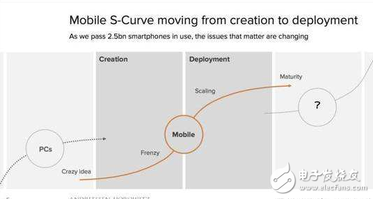 实际上,智能手机的创新时代已经结束了。在a16z,我们将其总结为新技术产品的S型曲线 (如图)。90年代的个人电脑产品就经历了同样的S曲线,PC现在的发展几乎停滞 (虎嗅编辑: 看一看联想电脑就知道了),智能手机也正在或即将面临同样的状况。虽然智能手机的摄像头性能会变得更强,芯片速度会变得更快,但是关于智能手机的战争已经结束了。