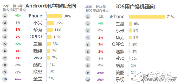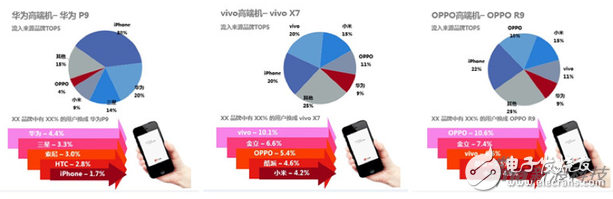 尤为一提的是,在高端市场,华为OV新三强对苹果形成了不小挑战。以华为P9、OPPO R9、vivoX7为例, iPhone都成为最重要的流入来源品牌。其中华为P9的新机来源占比中,苹果占比最高,达到38%;vivo X7的换机流入品牌中,iPhone以20%的流入比例与本品牌持平;而OPPO R9则获得了iPhone用户22%的流入占比,高于本品牌18%的流入比例。