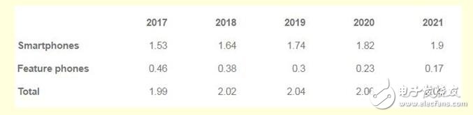 智能手机将继续占据大部分销售额,预计在2017年的出货量将达到15.3亿部。这一数字在2021年将增至19亿部,届时智能手机将占据整体手机市场92%的份额。