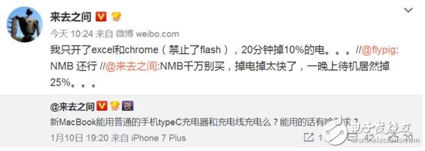 例如新浪微博CEO王高飞就表示,新MacBook Pro掉电太快,一晚上待机居然掉25%的电量。他称,自己只开了Excel和Chrome浏览器(禁止flash的前提下),20分钟就掉了10%的电,建议大家别买新款MacBook Pro。