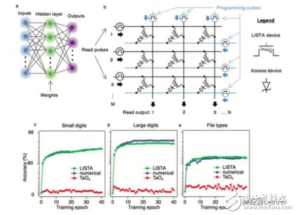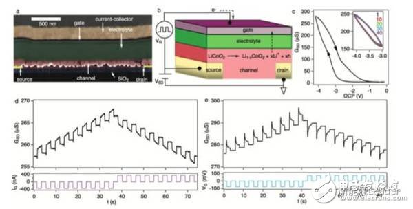 LISTA 的结构如上图所示,在SiO2的基板上覆盖了一层Pt和漏电极,并与一层120nm厚的LiCoO2导电通路相连,中间是一层400nm厚的LPON固体电解质,另一侧的覆盖了一层20nm厚的Si栅电极,其工作原理是通过在栅电极上施加电压,驱动Li+从导电通路经过固体电解质向栅电极迁移,从而控制导电通路中Li+的浓度,在Li+迁移出LiCoO2的过程中,LiCoO2完成了从绝缘体到金属导体的转变,达到控制导电通路导电性的目的。选用 LiCoO2的主要原因是其在固体电解质中稳定性好,并且具有良好的循环性能。LISTA的开关状态可以保持数周甚至是数月,虽然最终会由于自放电导致开关关闭,但是可以通过增加扩散势垒的方式得到很好的控制。实际上,目前的技术已经可以将LISTA的自放电率控制在<3%/年的水平,而神经网络一般也不会要求存储时间达到10年,一般在存储网络中的信息每星期都会被重写,所以目前LISTA的性能已经能够满足现有的要求。读写测试表明,在10%的容量下,LISTA的使用周期可达100000次,基本满足人工神经网络的需求,并且通过提高正极的晶体度和降低厚度,可以进一步的提升LISTA的循环性能,而且在目前的存储元器件中LISTA具有最高的信噪比,非常适合应用在人工神经网络之中。