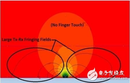 图2显示了未触摸状态下的磁力线示意图。在没有手指触碰的情况下,Tx-Rx磁力线占据了盖板内相当大的空间。边缘磁力线投射到电极结构之外,因此,术语“投射式电容”由之而来。