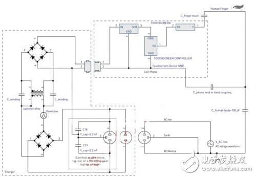触摸屏干扰的另一个潜在来源是电源供电手机充电器的开关电源。干扰通过手指耦合到触摸屏上,如图5所示。小型手机充电器通常有交流电源火线和零线输入,但 没有地线连接。充电器是安全隔离的,所以在电源输入和充电器次级线圈之间没有直流连接。然而,这仍然会通过开关电源隔离变压器产生电容耦合。充电器干扰通 过手指触摸屏幕而形成返回路径。