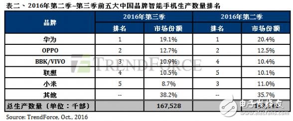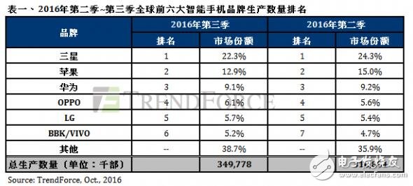 在一阵密集的新机发布潮之后,全球市场研究机构 TrendForce 率先发布了 2016 年第三季度全球智能手机生产报告。