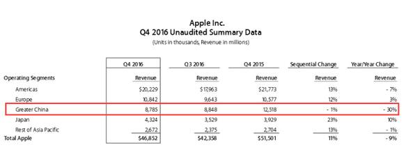 这次财报最“亮眼”的是大中华区营收,为87.85亿美元,比去年同期125.18亿美元下滑了30%。
