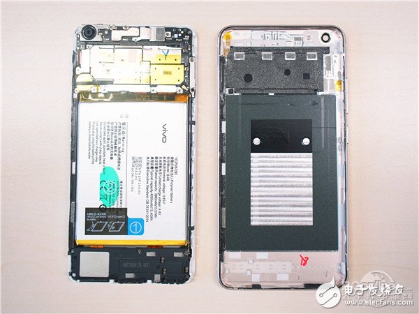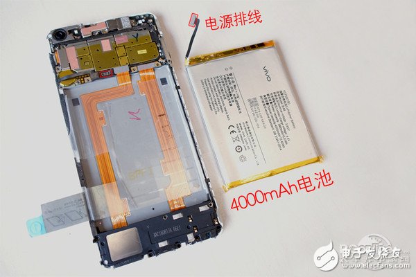 vivox7plus配备一块4000mAh的高能量密度电池,支持双引擎闪冲。电池通过双面胶附着在金属后壳上,尾插小板的走线在电池下方。
