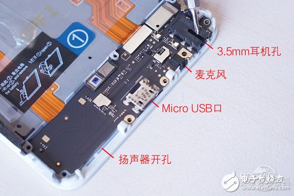 接下来进行扬声器模块的拆解,模块集成了扬声器、震动电机,都采用了触点与尾插小板进行连接。拧开所有螺丝,摘下保护罩。
