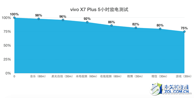 5小时放电测试尽可能模拟vivo用户的使用场景(屏幕亮度自动模式、音量50%、开启Wi-Fi),比如使用手机听HiFi音乐;使用柔光自拍每分钟拍一张图;微信则模拟语音、图片和文字发送过程;游戏场景则使用2K16大型游戏来测试。最终测试结果令人满意,在重度使用5小时之后,vivo X7 Plus还剩余75%的电量,放电曲线十分缓和,在线视频、游戏方面等功耗消耗较大的方面,省电效率还不错,按照这样的趋势来看,轻度用户使用1.5-2天不是问题。