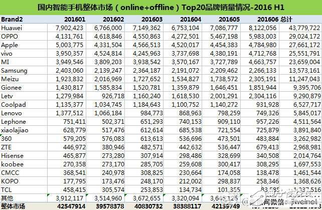 数据显示,2016年上半年,国内智能手机线下线上整体销量排名,华为以4377万部名列第一,OPPO 达到2900万部位列第二、苹果以2766万名列第三。vivo和小米分列四、五名。