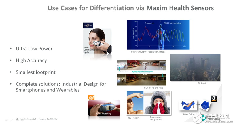 Allen随后具体介绍了采用Maxim健康(生物)和环境传感器方案实现产品差异化的应用案例,包括非接触式NFC温度计;甲醛、二氧化硫、一氧化碳等有毒气体检测;紫外线指数监测:网购时的商品颜色比对等等。上述应用场景的设计需求具有共同的特点:超低功耗、高准确度、最小的占位面积、完整的解决方案(即适用于手机和可穿戴设备的工业设计)。