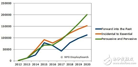 由于穿戴式装置在消费者的使用及发展上充满高度不确定性,NPD DisplaySearch对于这个市场的未来提供三种假设情况:「Forward into the Past」、「Incidental to Essential」以及「Persuasive and Pervasive」。在这三种假设情况下,市场皆会有一段时间发展比较疲软,而后恢复强劲的成长动能。