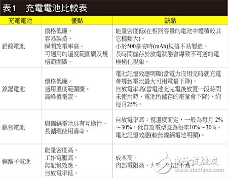 由表1优缺点看来,镍镉、镍氢及锂离子电池较适合使用在电子产品上;而锂离子电池无论是在体积、重量及容量(电子产品的使用时间)较优于镍镉、镍氢电池,也无记忆效应的问题,所以锂离子电池在电子产品使用上似乎方便许多。