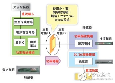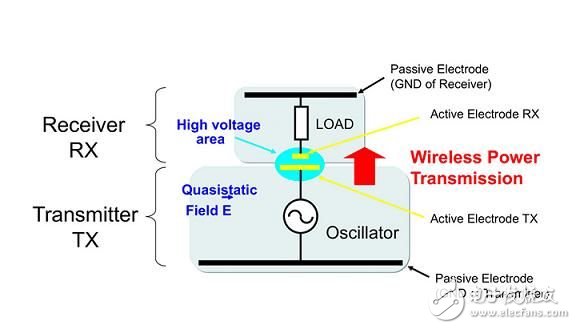 使用两组电极或极板就可以透过静电感测实现能量的传输。充电器或‘发送器’和可携式设备或‘接收器’用来有效地在组成电容器的合适尺寸金属表面间实现纵向的準静电耦合。其中驱动电极或主动电极要比另外一个电极小,上面施加的电压较高,另外一个电极则是被动电极,尺寸较长,上面的电压较低。当然正常情况下,电容器传输的能量是很小的,这与电极面积小有很大的关係。因此,为了满足给消费设备充电所需的功率水準(例如从5W至25W),需要增加电极尺寸和耦合的电压值,具体取决于实际的配置。