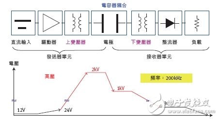 图2a显示了採用电容器传输能量的充电器方法例子架构图,其中使用的接收器和发送器模组是村田公司最近开发出的新产品。这种模组化方法允许工程师集中精力开发耦合区的电极设计,因而有助于快速开发出无线充电功能。透过静电方法传输的能量大小直接正比于所使用的频率。因此用更高的频率驱动电极对可以使设计处理更高的功率。然而,各个国家对所使用的频率和电场强度都有限制规定。实际上这种配置可以形成一种非常有效的天线结构,因此EMI因素通常会限制设计灵活性。为了实现耦合电极之间的无线收发、同时尽量减少对外的辐射量,需要进行正确地设计。因此需要进一步理解和确定正确的电极尺寸、它们的设计、工作电压、功率值、最佳工作频率和总的尺寸约束条件。一般情况下,理想的频率範围在200kHz至 1MHz之间,有效耦合区的电压值在800V至1.52kV之间。
