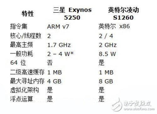 以下是三星Exynos5250(对最近推出的Cortex-A15的授权实施)和英特尔凌动S1260(S1200系列的高端产品)的简要对比情况。Exynos5系列应用于最新的SamsungGoogleChromebook和Nexus10平板电脑中。需要特别说明的是,三星Exynos5250与英特尔凌动S1260这两款处理器都仅是庞大的处理器家族中的,因此对某一市场所进行的最佳优化并不完全适合另一个市场。最典型的示例就是Exynos的4GB内存限制,这对于移动应用来说很正常,但是显然并不适合云计算。但是,Cortex-A15架构采用了一个40位的分页内存算法(“大物理地址扩展”),可支持高达1TB的内存。