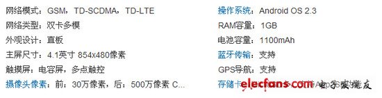 些款手机为4G手机,智能手机外观设计直板式主屏尺寸4.1英寸屏幕材质LCD分辨率(像素)854×480输入方式手写输入触摸屏类型电容触摸屏多点触摸支持多点触摸操作系统Google Android操作系统版本Android OS 2.3。支持TD-LTE网络。偏向于中低端产品。
