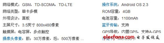 该机支持TD-LTE的横跨2G、3G和4G。一款多模双待智能手机,它采用一块3.5英寸触摸屏,分辨率为480×800像素,搭载1GHz处理器,配备4GB机身内存,运行Android 2.3操作系统,拥有500万像素主摄像头和30像素万前置摄像头,支持高速无线数据接入。