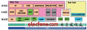 MCU的软件设计采用了小型操作系统来管理两个任务。SubTask用于和解码器进行通信,MainTask负责通信之外的所有处理,整个系统分为驱动层,中间层和应用层。驱动层包含了硬件设备和OS,有端子配置、按键输入、开关检测、AMP、FAN、RTC等;中间层则包含了需要向应用层提供的实现具体功能和动作的各个模块接口;应用层根据系统的功能,分为UI、OSD等模块,完成系统所需要实现的各种功能。MCU软件的系统构成如图3所示。