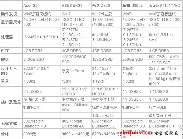 以下是几款超级本的参数比较: