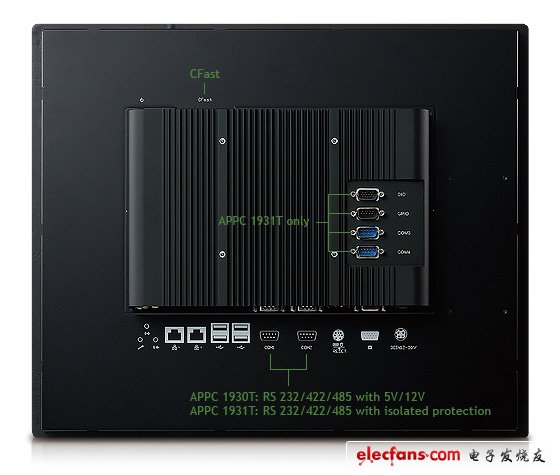 APPC系列无风扇平板电脑根据I/O选项可分成两种类型,以19寸为例,APPC 1930T配置2个RS232/422/485端口,支持5V和12V RI pin电源输入。同时,APPC 1931T支持2个RS232/422/485端口和4路DI/O,所有端口均提供2.5KV隔离保护。此外,APPC 1931T支持2个RS 232供电端口,1个GPI/O端口支持2路以上DI/O和亮度调节。该系列所有型号均支持双显示。搭配新汉相同尺寸的APPD工业级触摸显示器,在工厂车间,APPC系列将为用户带来视觉上的统一性。