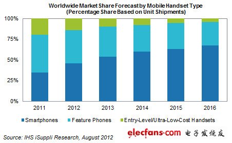 IHS iSuppli 的这份《全球无线市场跟踪报告》统计了三种类型的手机:智能手机、功能手机和入门级低价手机。并根据手机出货量和全球数据统计进行分析,2013年全球智能手机出货量为54%。到2016年,全球智能手机出货量将占到67.4%,每三部手机里面就有2部是智能手机。